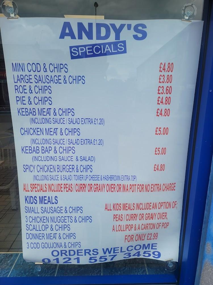 Situated at 10 Unity Walk, Tipton DY4 8QL, Andy's Fish and Chip Restaurant stands out in the local dining scene for its dedication to traditional fish and chips. With access to public transport and free parking options, visiting is a breeze. This casual eatery is wheelchair accessible, ensuring all guests enjoy their time without hassle. Known for its friendly atmosphere, Andy's is a popular choice for families and solo diners alike. Just a couple of minutes' walk from a lovely park, it’s an excellent pit stop after a day of fun.